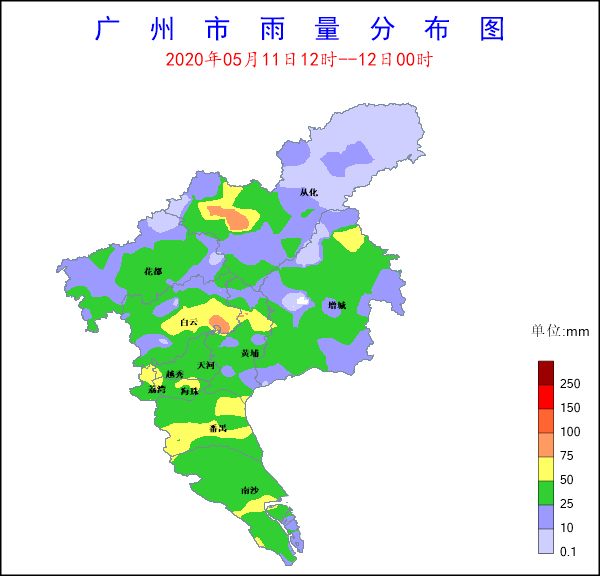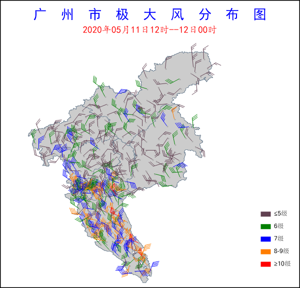 2020年5月11日中午到夜間,受冷空氣和切變線影響,廣州出現(xiàn)大到暴雨局部大暴雨過程,并伴有強(qiáng)雷電和8級(jí)以上大風(fēng)。據(jù)統(tǒng)計(jì),自11日12時(shí)至24時(shí),全市平均面雨量為29毫米,189個(gè)站點(diǎn)(53%)錄得25~50毫米降水,73個(gè)站點(diǎn)(20%)錄得50~100毫米降水,1個(gè)站點(diǎn)錄得100毫米以上降水,白云區(qū)太和鎮(zhèn)穗豐村錄得全市大降水量104.8毫米。各區(qū)最大雨量分別為(單位:毫米):南沙60.8,番禺73,黃埔62.6,荔灣65.4,海珠64.1,白云104.8,從化84.5,天河56.9,越秀55.3,花都54.1,增城64.7。全市共有57個(gè)站點(diǎn)(15%)出現(xiàn)8級(jí)以上大風(fēng),南沙區(qū)南沙街虎門大橋錄得全市最大陣風(fēng)25.7米/秒(10級(jí))。