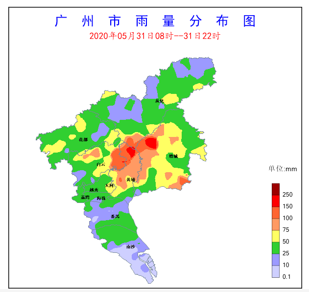 2020年5月31日早晨至夜間,受雷雨云團(tuán)影響,我市出現(xiàn)大到暴雨局部大暴雨。08時至22時,全市平均面雨量39.1毫米,共有267個測站錄得25毫米以上的雨量,76個測站錄得50毫米以上的雨量,15個測站錄得100毫米以上的雨量,其中增城區(qū)中新鎮(zhèn)聯(lián)錄得全市最大雨量173.4毫米;全市共出現(xiàn)閃電27985次。