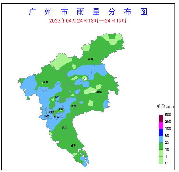 4月24日13時(shí)至19時(shí),我市出現(xiàn)了中到大雨、局部暴雨,并伴有6-8級(jí)大風(fēng)和雷電。全市共有428個(gè)站點(diǎn)(93.2%)出現(xiàn)降雨,平均雨量23.6毫米,其中1個(gè)站點(diǎn)(0.2%)雨量在50~100毫米之間,173個(gè)站點(diǎn)(37.7%)雨量在25~50毫米之間。各區(qū)平均雨量(單位:毫米):海珠區(qū)38.5,越秀區(qū)36.5,天河區(qū)34.1,荔灣區(qū)32.9,白云區(qū)29.1,黃埔區(qū)24.7,花都區(qū)23.5,番禺區(qū)23.2,增城區(qū)19.5,從化區(qū)18.6,南沙區(qū)16.7,其中海珠區(qū)官洲街錄得全市最大累積雨量52.3毫米。全市共有48個(gè)站點(diǎn)(10.5%)錄得6級(jí)以上陣風(fēng),其中2個(gè)站點(diǎn)(0.4%)錄得8級(jí)陣風(fēng),46個(gè)站點(diǎn)(10%)錄得6~7級(jí)陣風(fēng),南沙區(qū)欖核鎮(zhèn)錄得全市最大瞬時(shí)大風(fēng)18.7米/秒(8級(jí))。