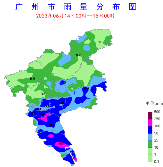 受高空波動和季風(fēng)低壓影響,6月14日我市中南部地區(qū)出現(xiàn)了暴雨、局部大暴雨,并伴有6-7級大風(fēng)和雷電,雨勢較強(qiáng)時段為5-8時和13-18時。全市共有445個站點(94.9%)出現(xiàn)降雨,平均雨量42.4毫米,其中29個站點(6.2%)雨量在100~250毫米之間,138個站點(29.4%)雨量在50~100毫米之間,92個站點(19.6%)雨量在25~50毫米之間。各區(qū)平均雨量(單位:毫米):海珠區(qū)89.1,南沙區(qū)74.5,天河區(qū)72.6,番禺區(qū)62.7,黃埔區(qū)53.2,越秀區(qū)52.1,荔灣區(qū)47.2,增城區(qū)34,白云區(qū)19,從化區(qū)14.1,花都區(qū)11,其中南沙區(qū)南沙街錄得全市最大累積雨量165.1毫米。期間,全市共有39個站點(8.3%)錄得6~7級,番禺區(qū)南村鎮(zhèn)錄得全市最大陣風(fēng)16.7米/秒(7級)。