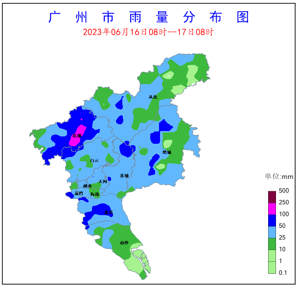 受南風(fēng)加強(qiáng)影響,6月16-17日我市中部地區(qū)出現(xiàn)了暴雨,其中花都區(qū)有大暴雨,并伴有6-8級大風(fēng)和雷電,雨勢較強(qiáng)時(shí)段為16日19-21時(shí)和17日04-07時(shí)。全市共有441個(gè)站點(diǎn)(93.6%)出現(xiàn)降雨,全市平均雨量36.3毫米,7個(gè)站點(diǎn)(1.5%)雨量在100~250毫米之間,76個(gè)站點(diǎn)(16.1%)雨量在50~100毫米之間,225個(gè)站點(diǎn)(47.8%)雨量在25~50毫米之間。各區(qū)平均雨量(單位:毫米):花都區(qū)67,番禺區(qū)43.3,天河區(qū)42.6,黃埔區(qū)40.9,越秀區(qū)40.6,海珠區(qū)38.6,白云區(qū)37.6,荔灣區(qū)36.4,增城區(qū)33.7,從化區(qū)26.3,南沙區(qū)17.4,其中花都區(qū)新華街錄得全市最大累積雨量121.5毫米。期間, 全市共有31個(gè)站點(diǎn)(6.6%)錄得6級以上陣風(fēng),1個(gè)站點(diǎn)(0.2%)錄得8~10級陣風(fēng),30個(gè)站點(diǎn)(6.4%)錄得6~8級陣風(fēng),花都區(qū)獅嶺鎮(zhèn)錄得全市最大陣風(fēng)17.4米/秒(8級)。