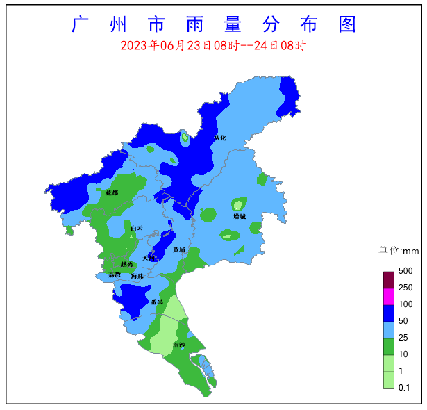受西南季風和高空槽影響,6月23-24日我市出現了暴雨、局部大暴雨,并伴有8-10級陣風和雷電,雨勢較強時段為23日12-15時和24日04-07時。全市共有442個站點(93.6%)出現降雨,全市平均雨量36毫米,1個站點(0.2%)雨量在100~250毫米之間,103個站點(21.8%)雨量在50~100毫米之間,198個站點(41.9%)雨量在25~50毫米之間。各區平均雨量(單位:毫米):從化區51.5,天河區44.4,番禺區41.6,黃埔區39.3,花都區38.3,海珠區36.6,增城區33.1,白云區26.7,荔灣區23.7,越秀區23,南沙區18.5,其中番禺區石壁街錄得全市最大累積雨量105.9毫米。全市共有:280個站點(59.3%)錄得6級以上陣風,5個站點(1.1%)錄得10~12級陣風,62個站點(13.1%)錄得8~10級陣風,213個站點(45.1%)錄得6~8級陣風,黃埔區聯和街錄得全市最大陣風28.4米/秒(10級)。