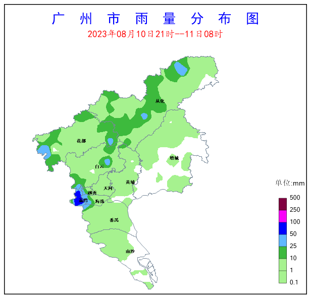 受低層西南急流和中層低渦影響,8月10日夜間至11日早晨我市出現(xiàn)了中到大雨局部暴雨,并伴有6-7級陣風和雷電,雨勢較強時段為10日23時至11日02時。392個站點(82.4%)出現(xiàn)降雨,全市平均雨量6.5毫米,14個站點(2.9%)雨量在50~100毫米之間,13個站點(2.7%)雨量在25~50毫米之間。各區(qū)平均雨量(單位:毫米):荔灣區(qū)60.2,海珠區(qū)20.5,花都區(qū)10,從化區(qū)9.1,越秀區(qū)8.1,白云區(qū)8,番禺區(qū)2.2,黃埔區(qū)1.2,天河區(qū)0.9,增城區(qū)0.6,南沙區(qū)0.5,其中荔灣區(qū)東漖街錄得全市最大累積雨量87.8毫米。全市共有:15個站點(3.2%)錄得6級以上陣風,15個站點(3.2%)錄得6~8級陣風,從化區(qū)鰲頭街錄得全市最大陣風16.9米/秒(7級)。