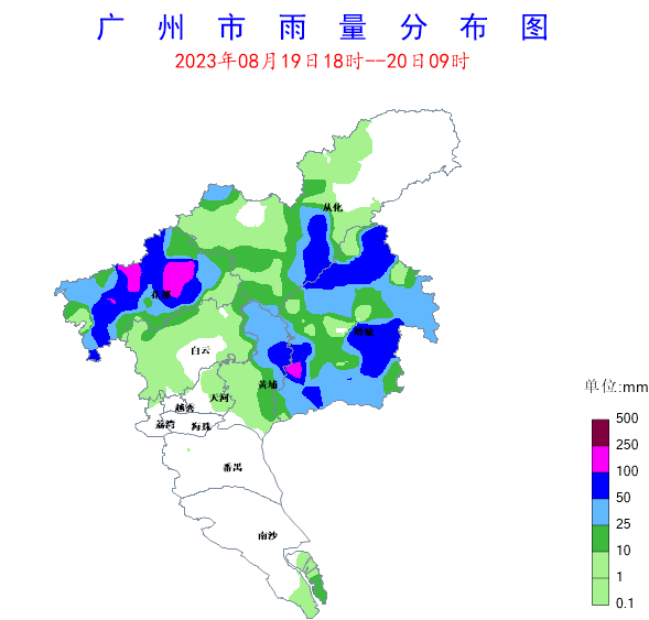受中層低渦和低層切變線影響,8月19日夜間至20日早晨我市出現了中到強雷雨局部暴雨到大暴雨。19日18時至20日9時,全市共有250個站點(52.5%)出現降雨,全市平均雨量14.4毫米,9個站點(1.9%)雨量在100~250毫米之間,35個站點(7.4%)雨量在50~100毫米之間,44個站點(9.2%)雨量在25~50毫米之間。各區最大雨量(單位:毫米):花都區花山鎮鄺維煜小學159.9,增城區永寧街葉嶺村130.9,從化區溫泉新田氣象觀測站101.6,黃埔區新龍鎮九龍二小氣象觀測站93.8,南沙區港集裝箱三期碼頭氣象觀測站(龍穴街道)22.9,白云區鐘落潭鎮新和村19.5,天河區黃村街奧體路1.8,番禺區大石街植村0.3,越秀區登峰街白云山麓湖公園苗圃地應用氣象站0.1,荔灣區東沙街南漖水閘0.1,海珠區華洲街龍潭村2(濕地公園生態站)0.1。