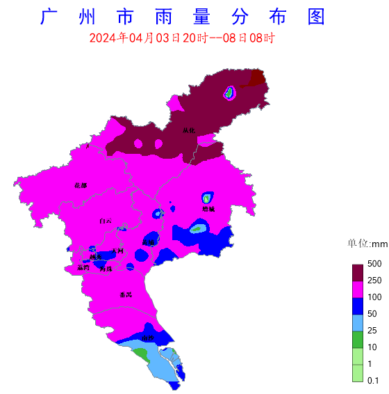 累積雨量多:本次降水持續時間長,其中強降水集中時段和落區為:4日19時至5日08時(從化、增城北部)、5日12時至20時(從化、增城北部、番禺、南沙北部)、6日09時至7日00時(全市)、7日11時至15時(花都、白云、天河、黃埔)。由于降水時間長且多輪強降水落區重疊,導致累積雨量多:全市平均達161.8毫米,在近十年四月暴雨過程中排名第一;70.5%測站累積雨量在100~250毫米之間,11.5%測站累積雨量超過250毫米,從化呂田、良口累積雨量超400毫米,其中呂田蓮麻錄得全市最大累積雨量534.6毫米,不僅比當地四月平均月雨量偏多1.7倍,還打破了1961年以來四月全市暴雨過程單站累積雨量最高記錄(2005年“4.24-28”460.4毫米)。