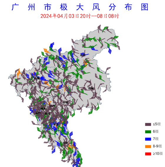 強對流明顯:過程中我市37.6%測站錄得6級以上陣風,3.2%測站錄得8級以上陣風。花都區赤坭鎮錄得全市最大陣風24.2米/秒(9級)。荔灣、番禺出現局地小冰雹。